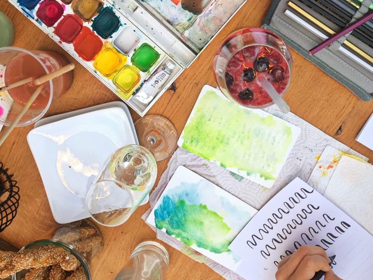 Nach gezielten Übungen, die eure Kreativität anregen, geht es ans Gestalten – wahlweise mit einer Glasplatte oder einem Teeglas. Begleitet wird das Event von feinen Frühstückshäppchen und entspannenden Drinks.