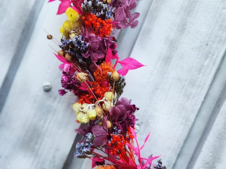 Wir starten gemeinsam in den Sommer! In diesem Workshop bindest du deinen eigenen Kranz auf einem Metallring – mit kräftigen Trockenblumen in ausdrucksstarken Farben wie Pink, Orange oder Lila.